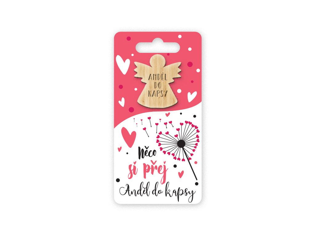 Kapesní objetí je malý a milý dárek darovaný od srdce, který udělá velkou radost. Dřevěný symbol ve tvaru andílka s textem "anděl do kapsy" slouží jako štěstíčko. Na kartičce najdete milý text "Něco si přej".