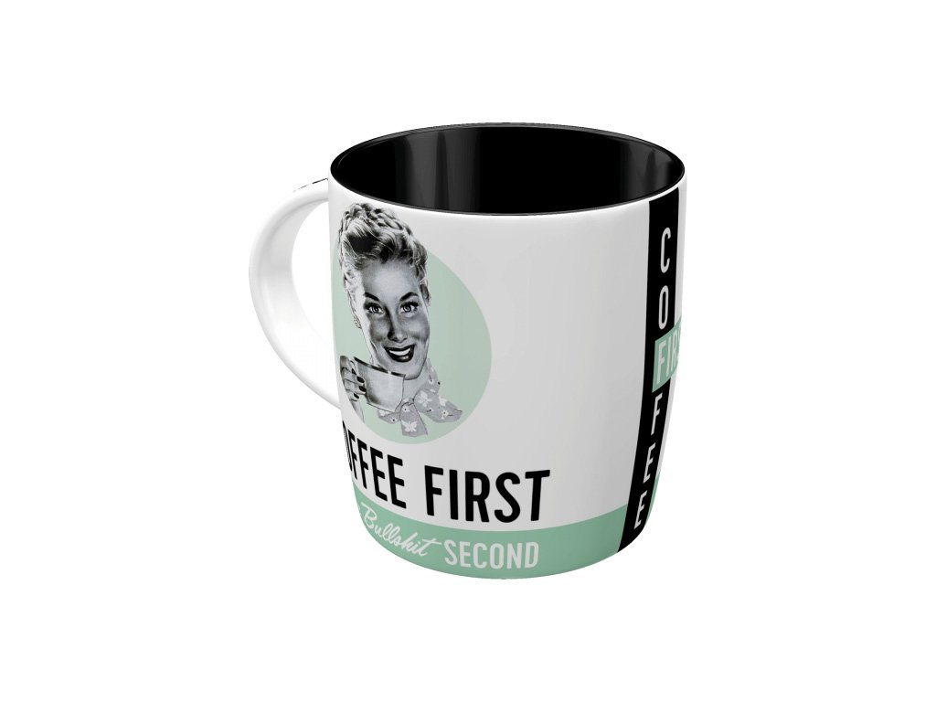 Tento hrnek "Coffee First, Bullshit Second" je skvělým dárkem pro všechny, kteří mají rádi vtipné retro dekorace.