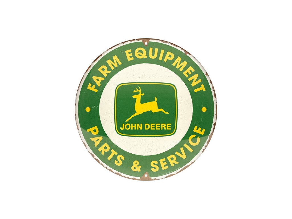 Retro kulatá plechová cedulka "John Deere" je originální dekorace.