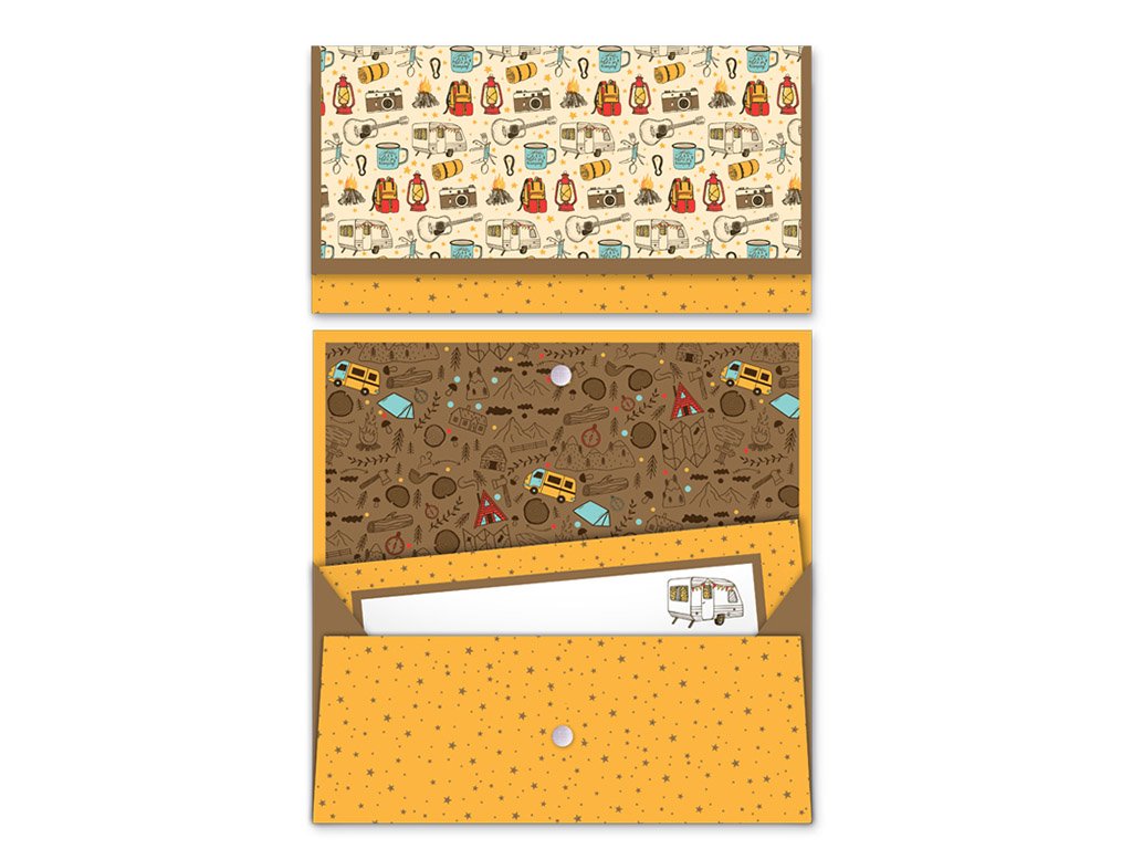 Darujte příspěvek na novou výbavu, letenky nebo vysněnou dovolenou v balení, které ladí s duší dobrodruha. Tato obálka s bohatou ilustrací kempování, outdoorového vybavení a lesních motivů promění i obyčejnou bankovku v pozvánku na další výpravu.