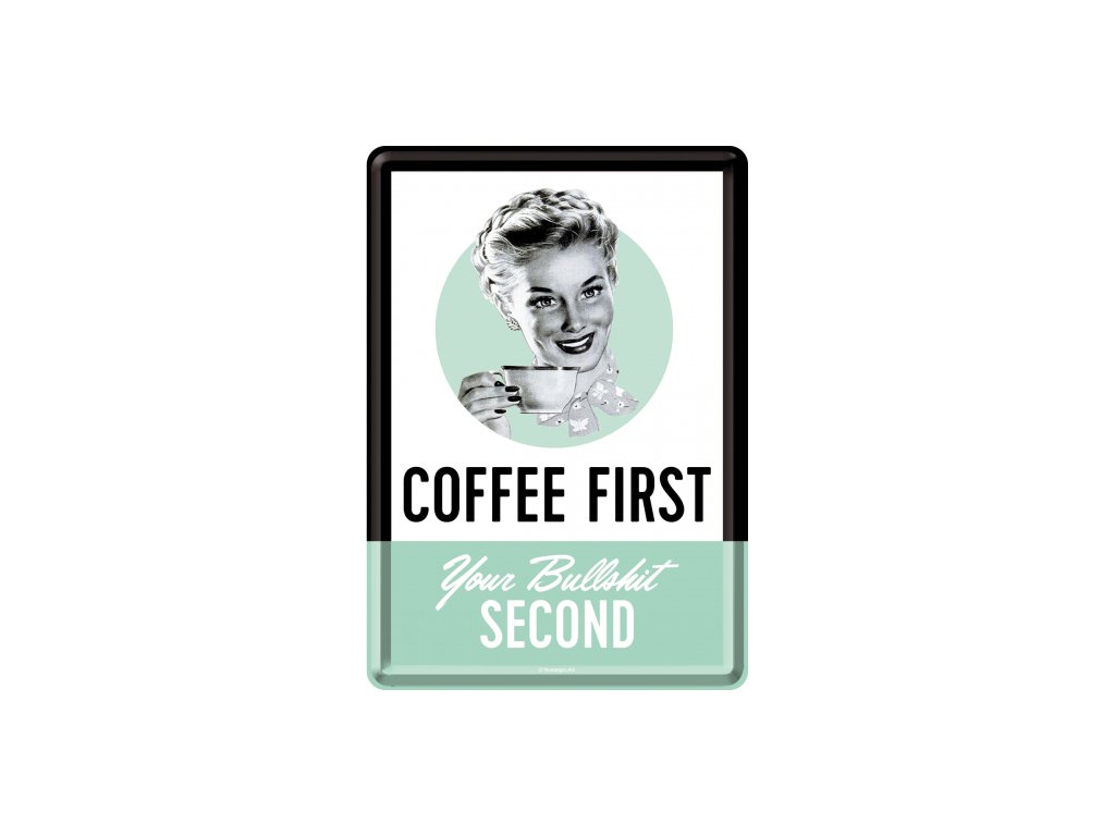 Tato plechová pohlednice "Coffee First" je skvělým dárkem pro všechny, kteří mají rádi vtipné retro dekorace. Je vyrobena z kvalitního plechu a je možno ji umístit na dveře, stěnu nebo na poličku.