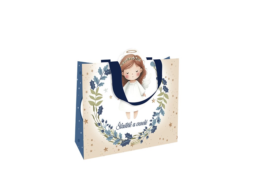 Vánoční dárková taška střední s výsekem Andílek šťastné a veselé
