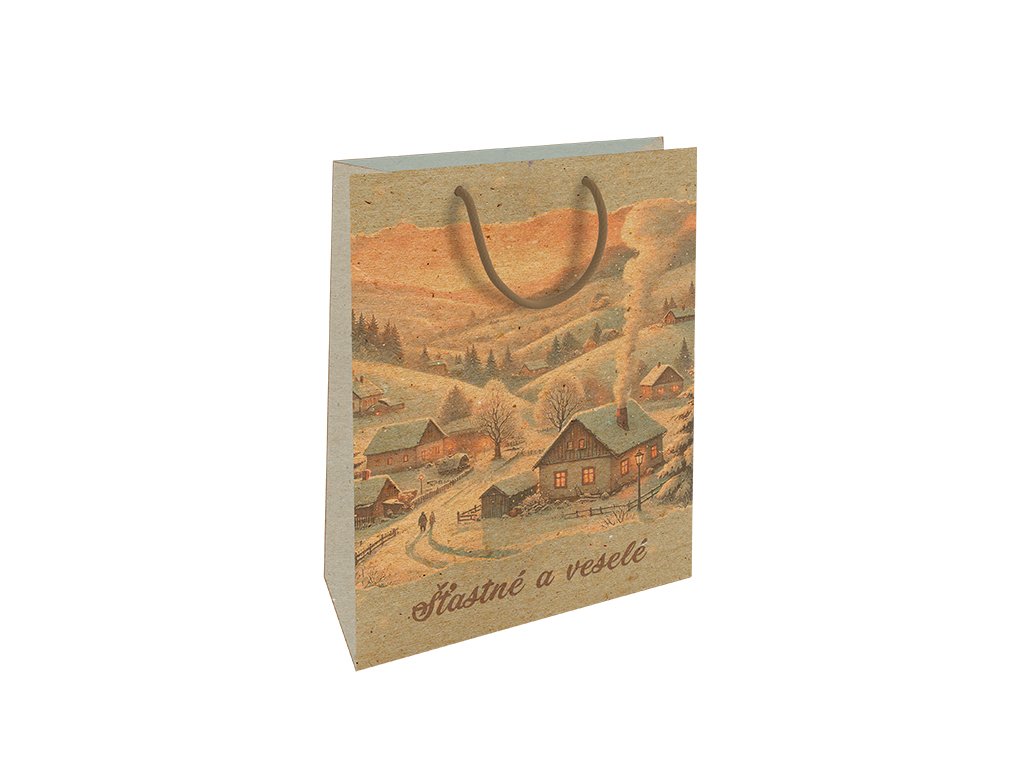 Vánoční dárková taška velká kraft Zasněžená vesnice šťastné a veselé